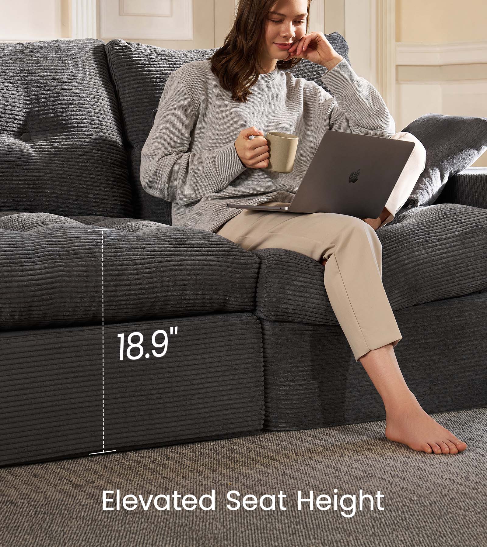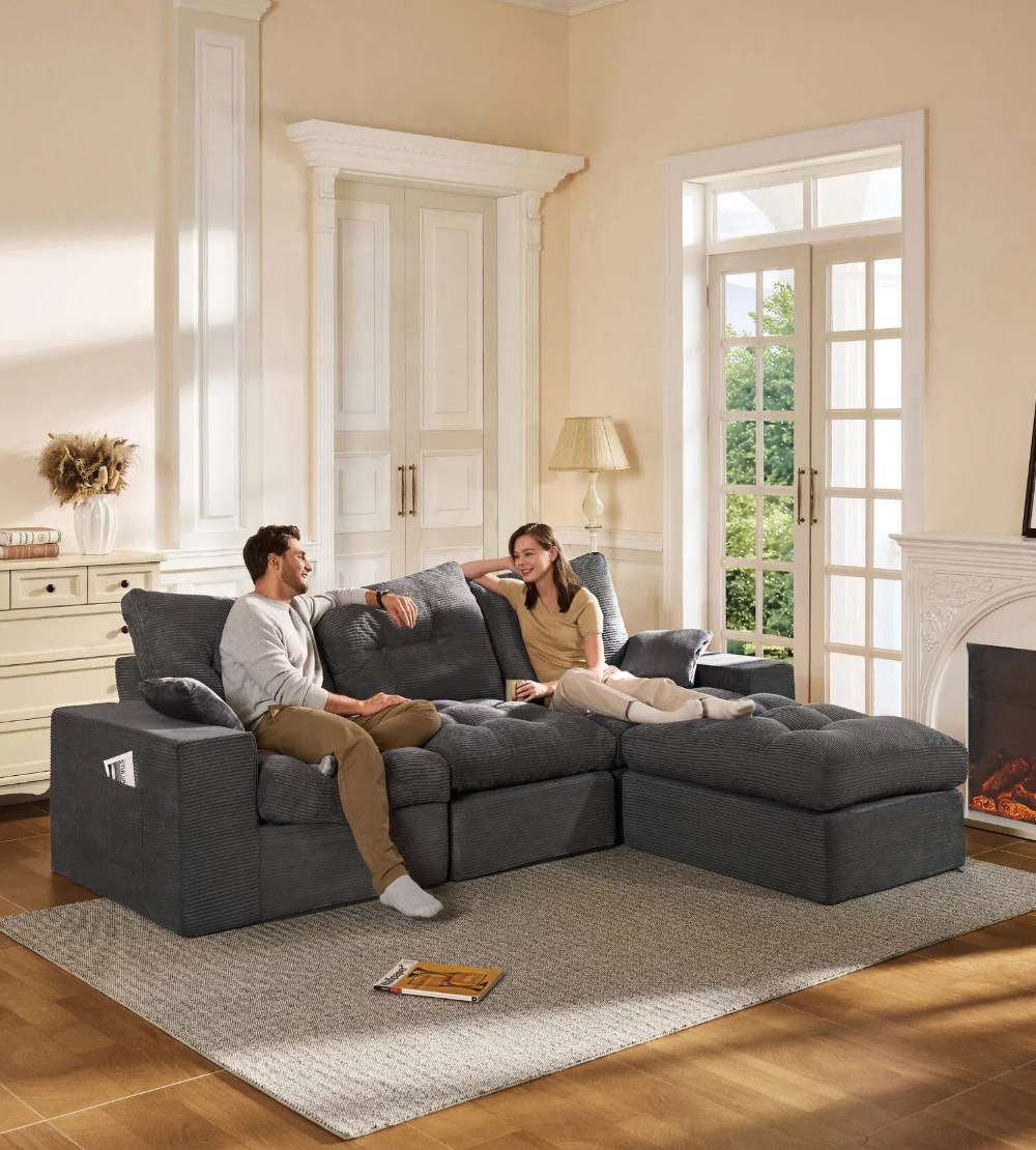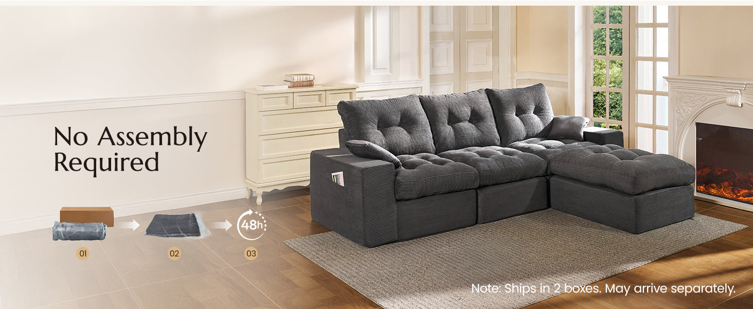 3-Seater Ergonomic High-Back Modular Sectional Couch-Supportive Seating, Corduroy Dark Grey