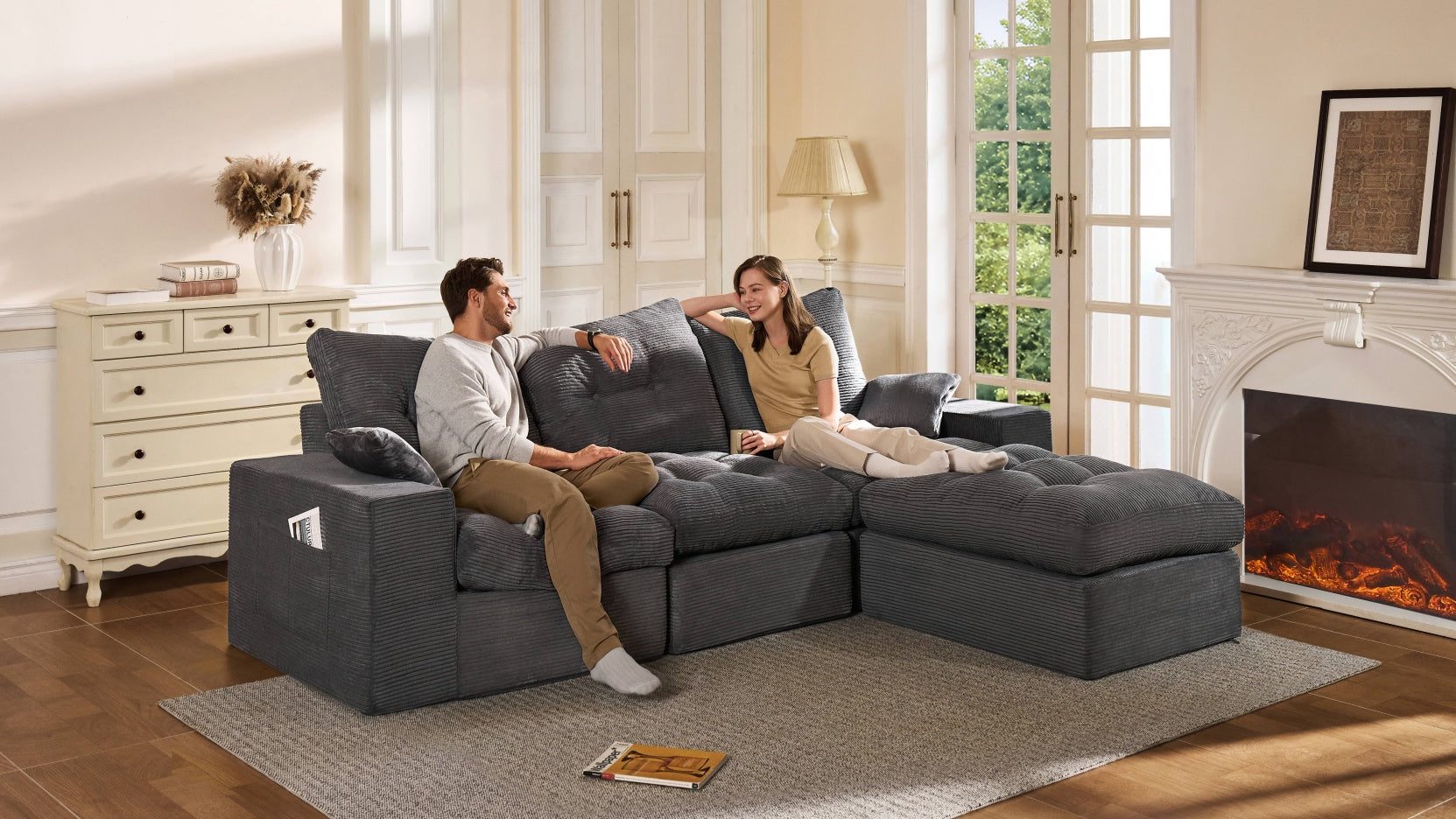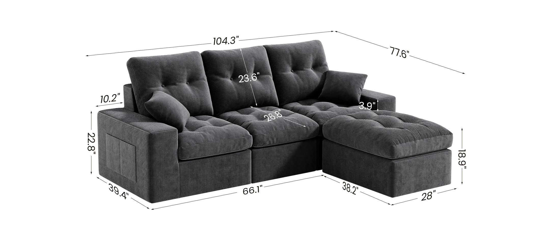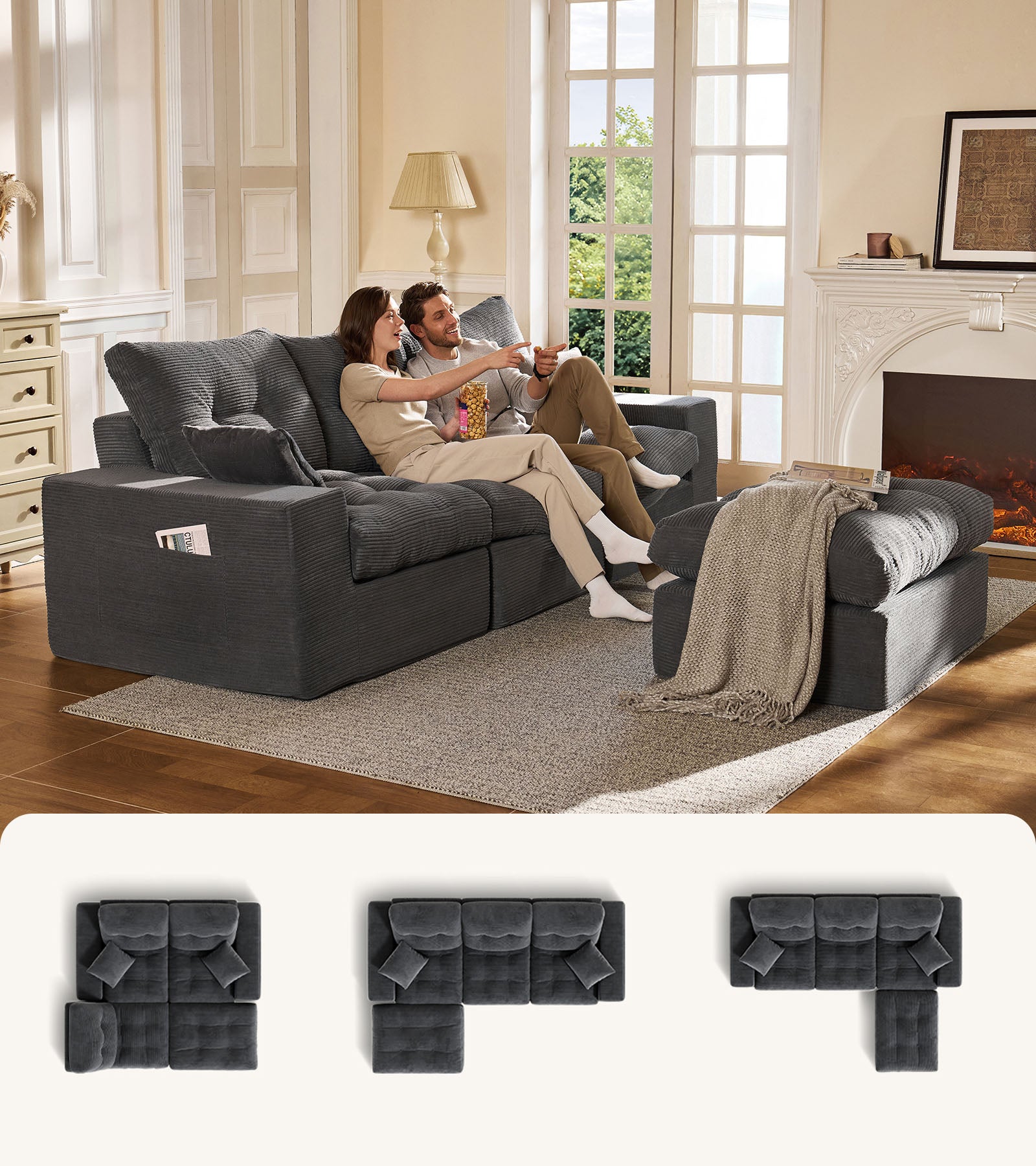 3-Seater Ergonomic High-Back Modular Sectional Couch-Supportive Seating, Corduroy Dark Grey