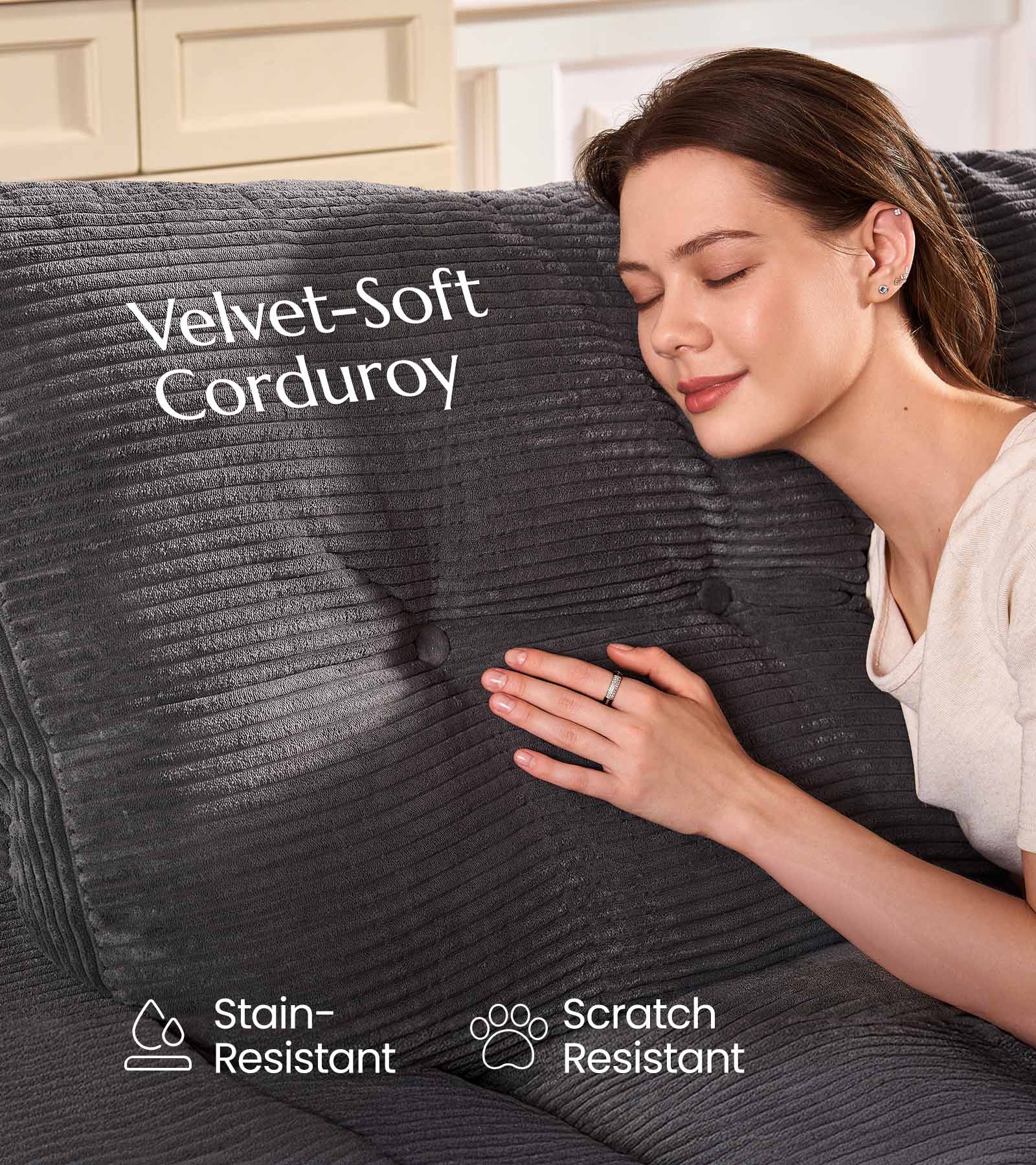 This sofa is made of soft, plush corduroy fabric, which is not only comfortable but also stain-resistant, waterproof, and scratch-resistant,making it a smart choice for families, pet owners, or anyone who uses furniture daily.