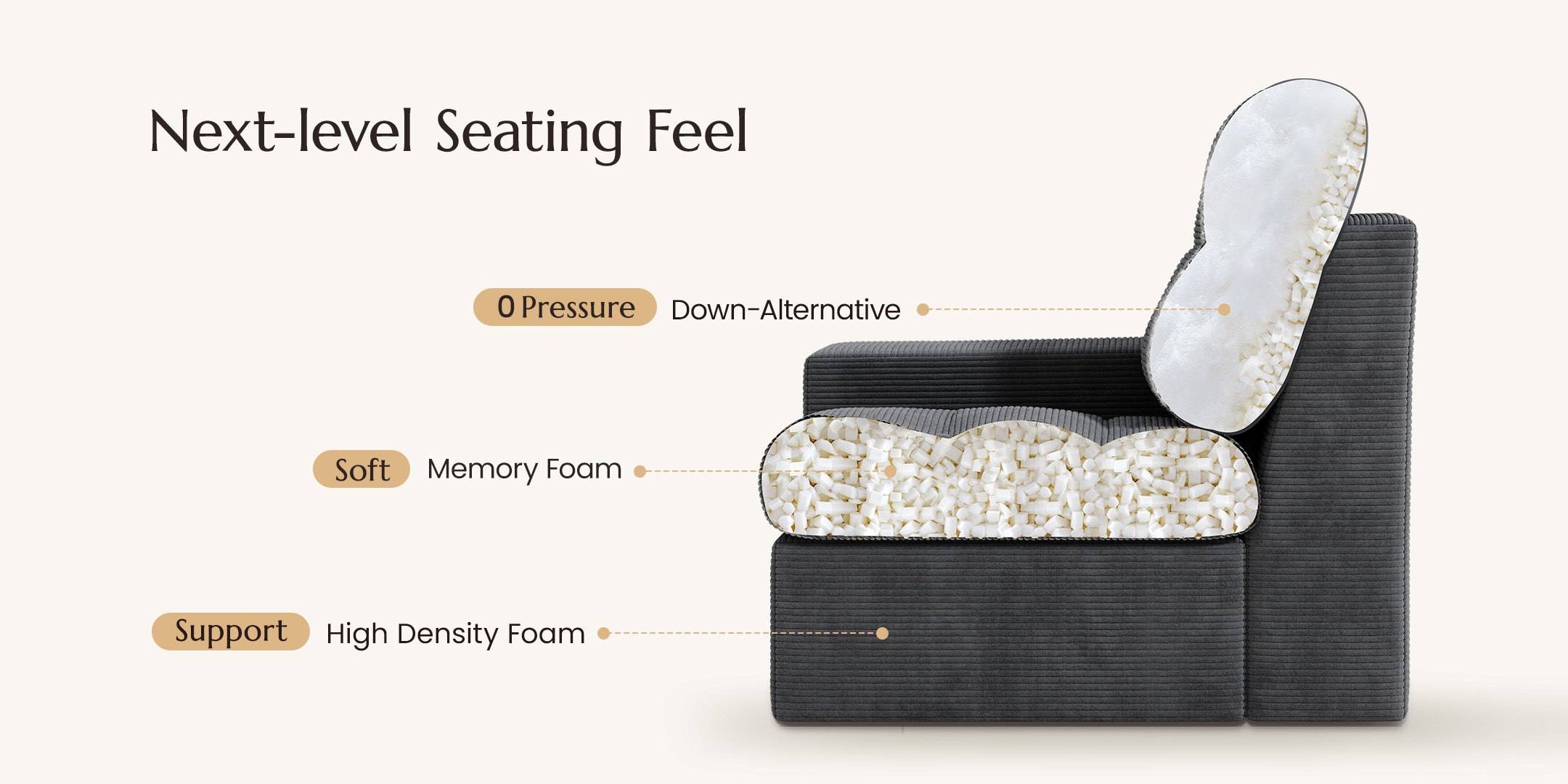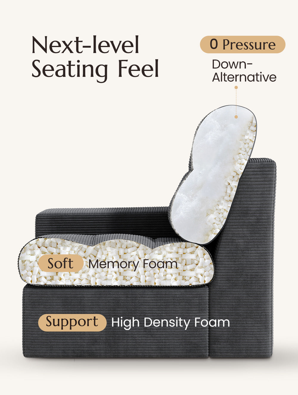 Our dual-layer cloud couch features memory foam that gently cradles your body for pillowy softness, combined with high-resiliency foam for firm support.