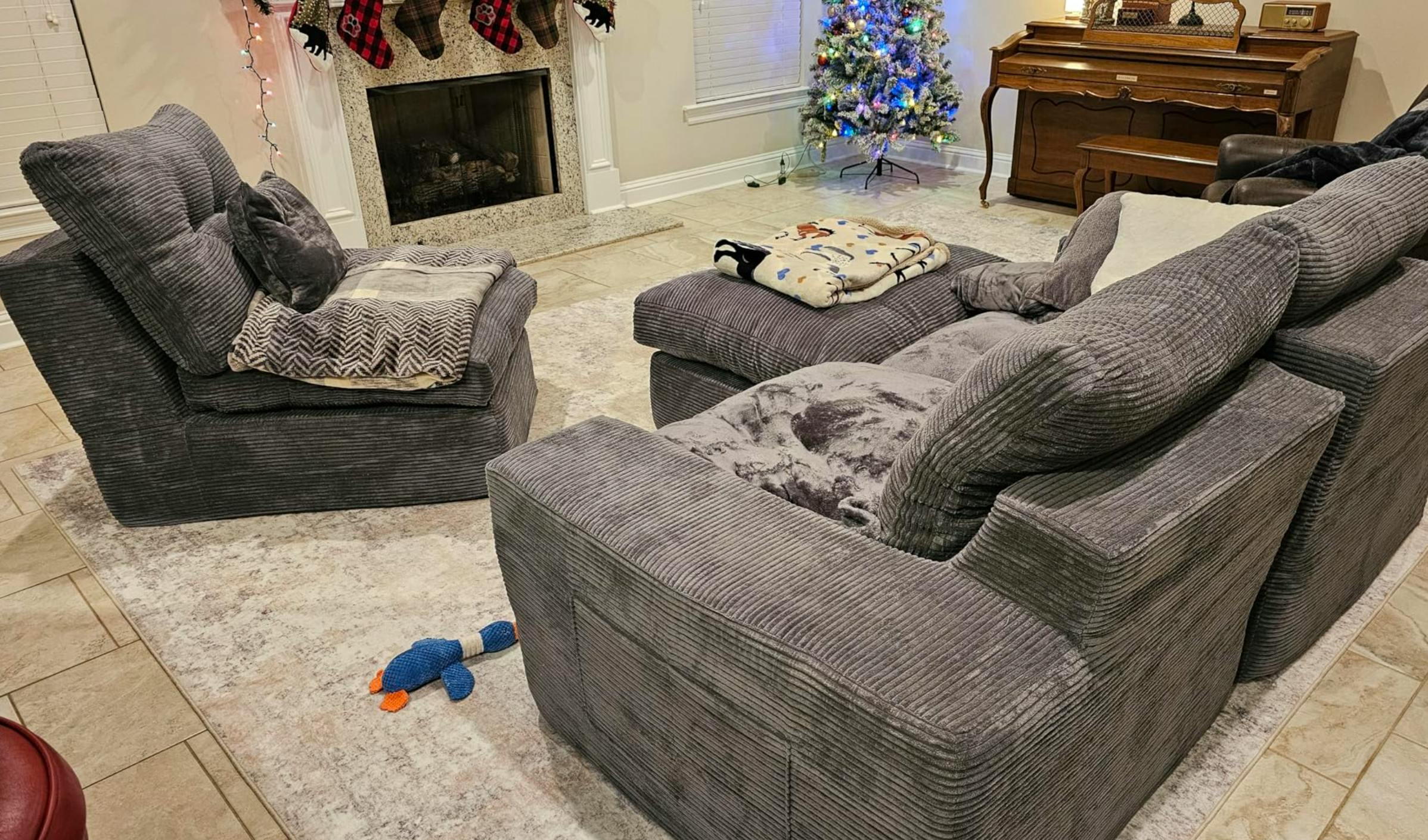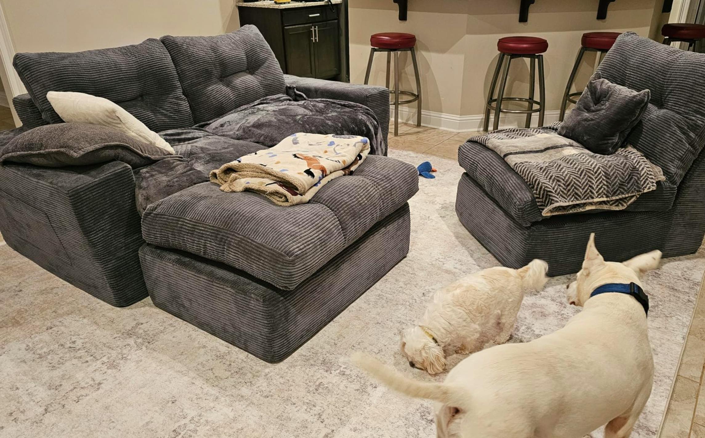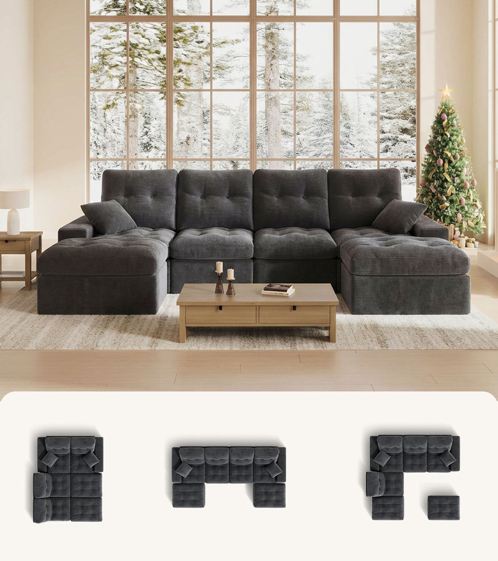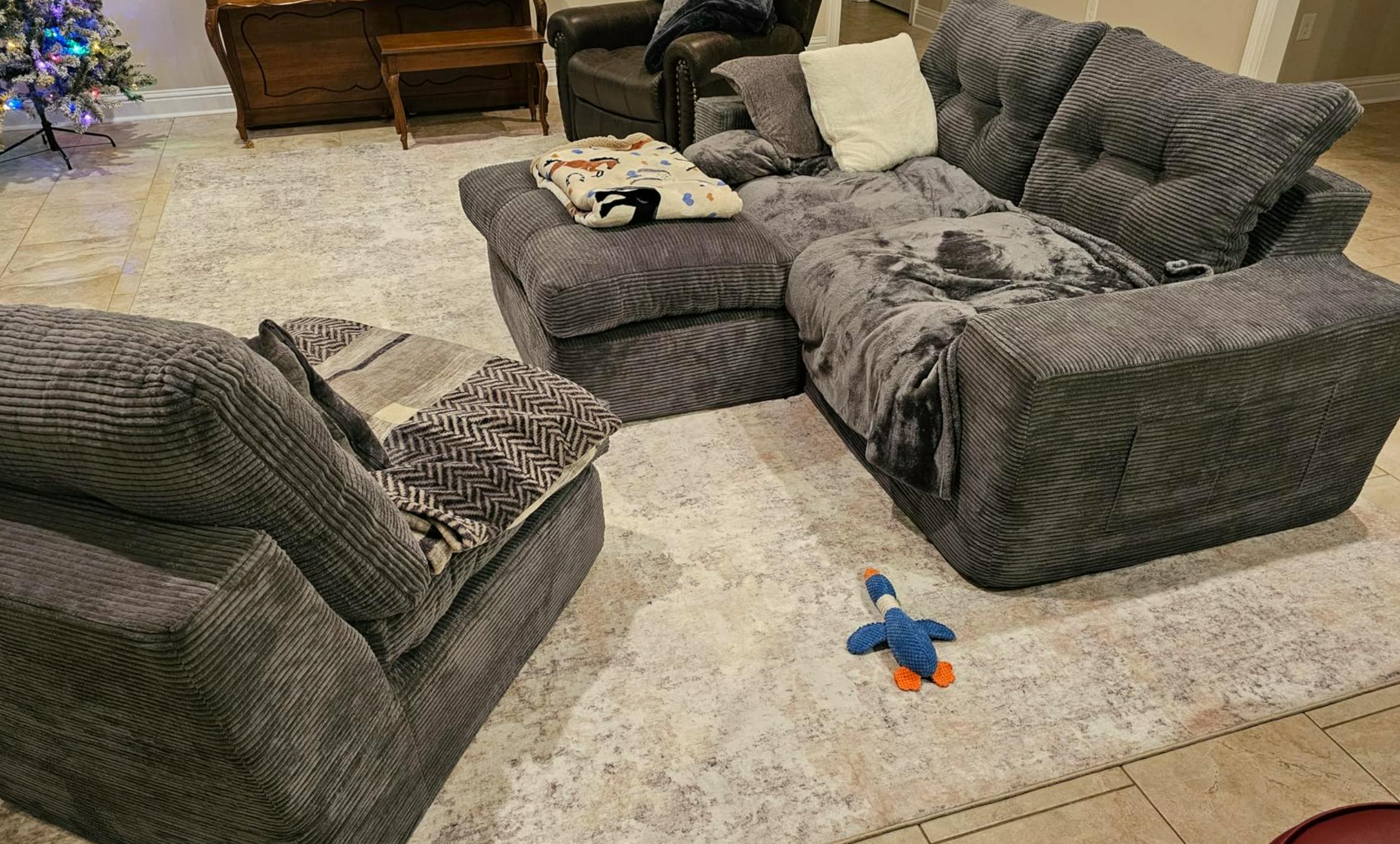 This sectional couch includes 2 multi-functional pillows that unzip into cozy 60" x 80" flannel blankets---perfect for movie nights and effortless lounging.
